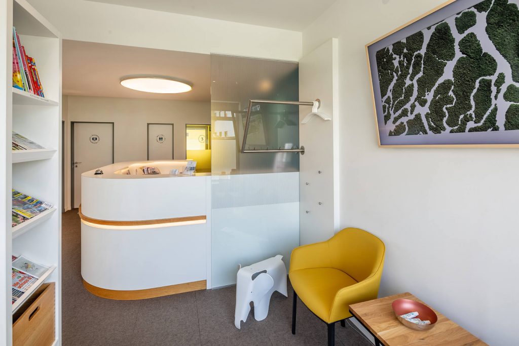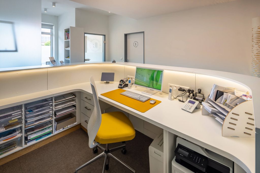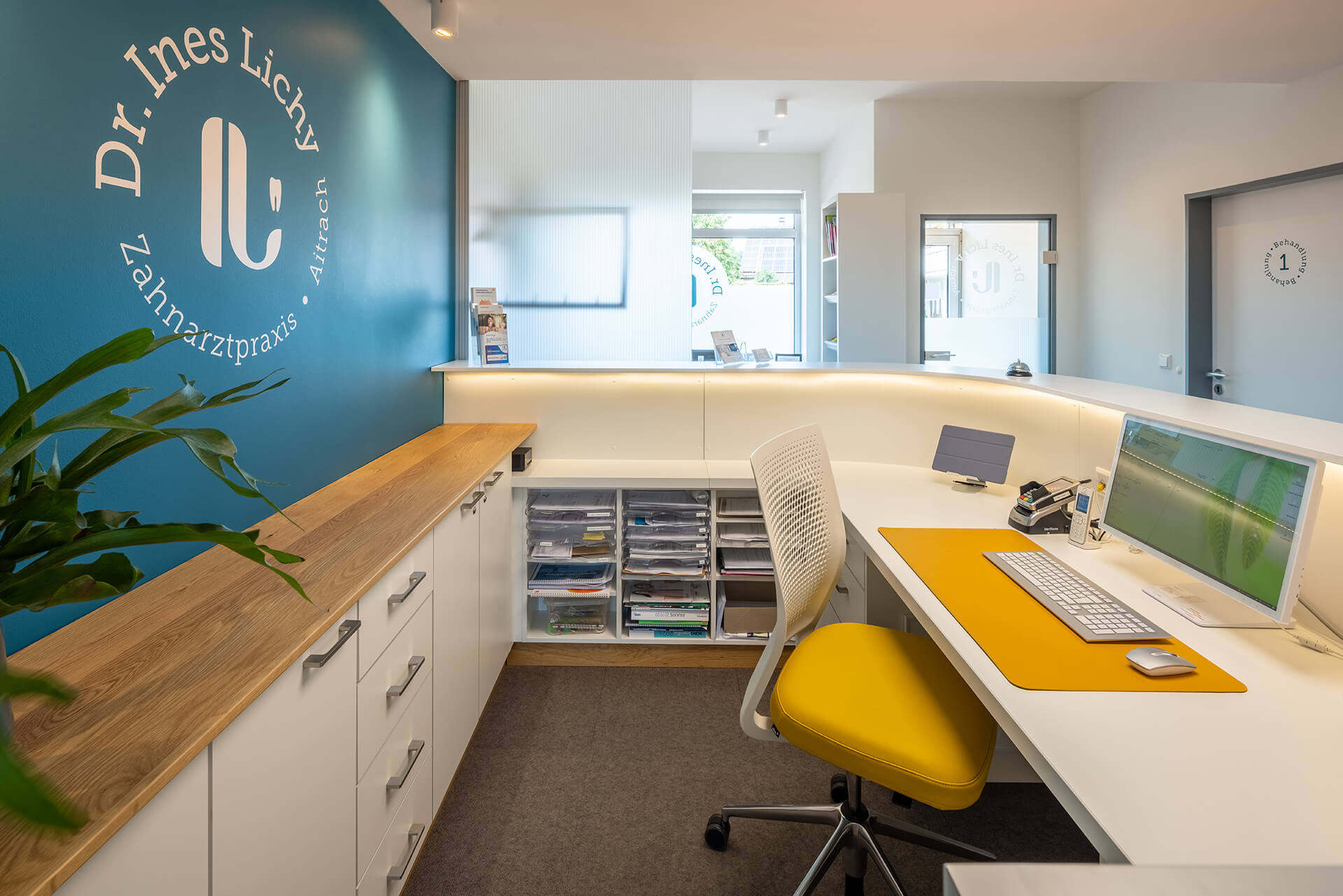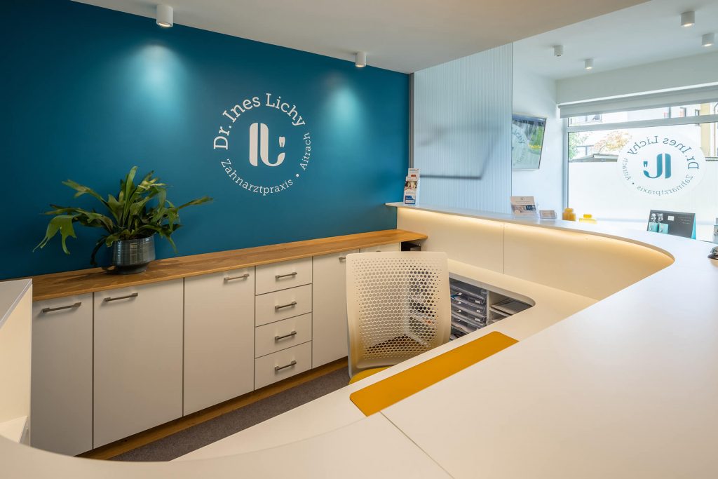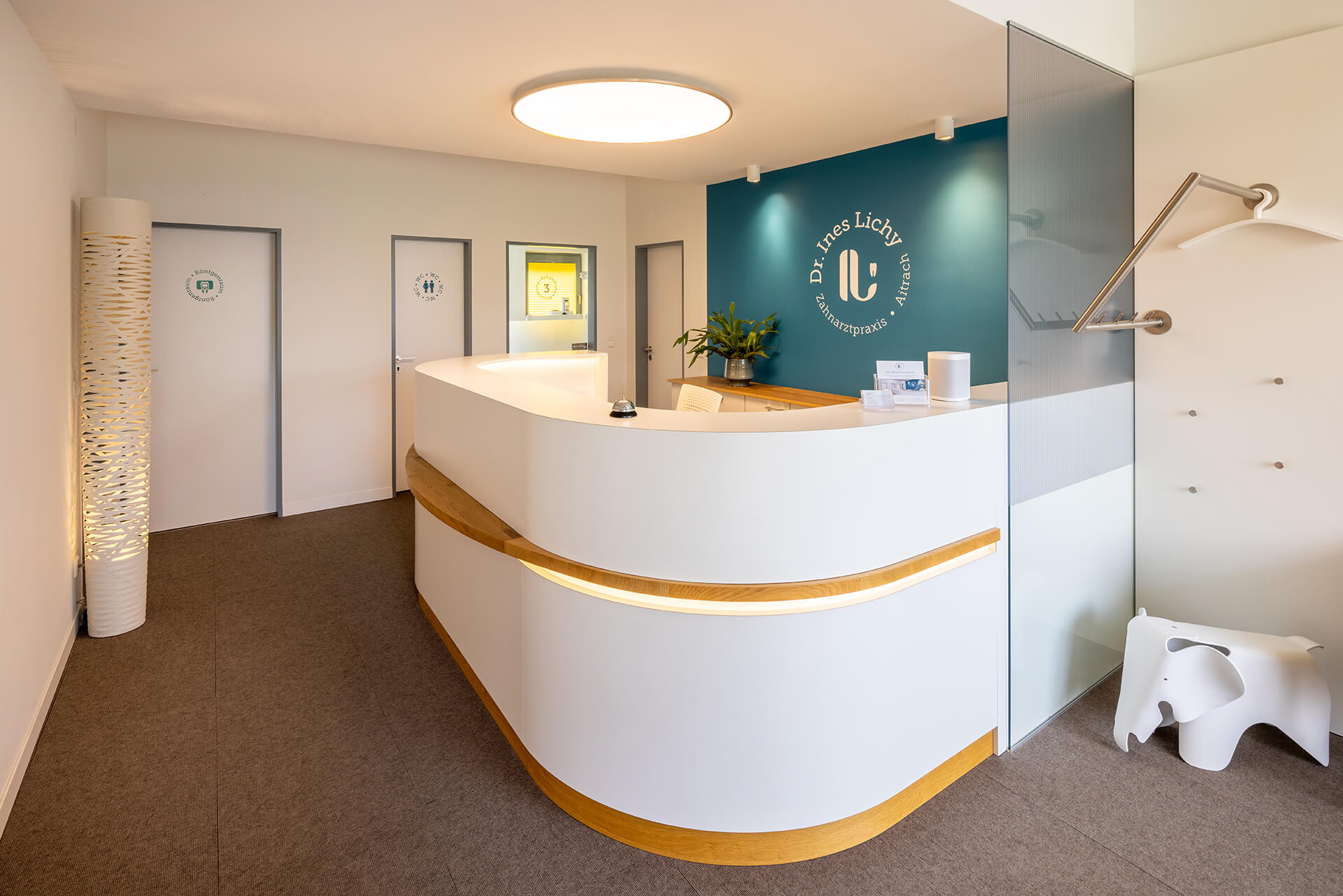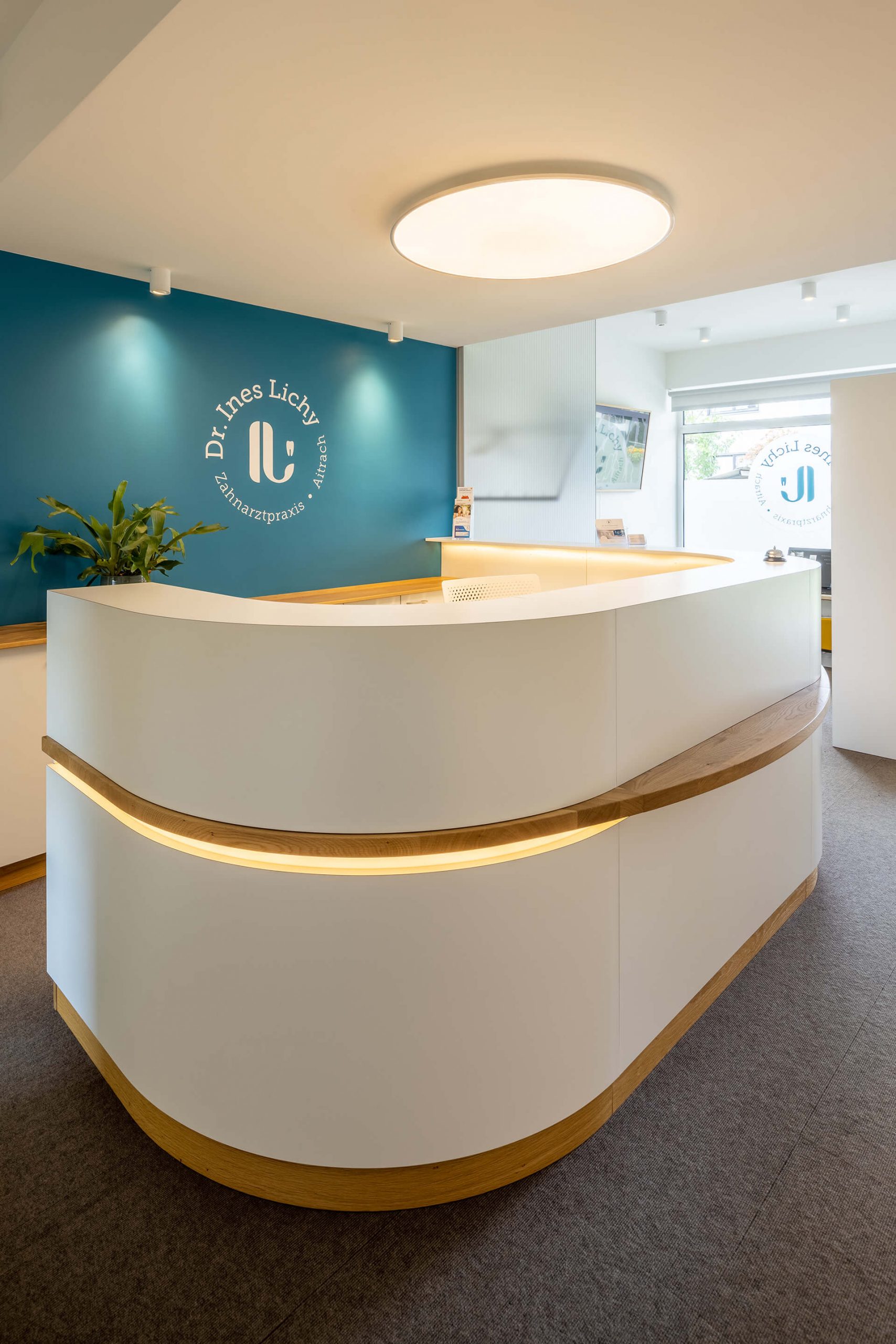 Moderne Empfangstheke in Kombination mit Massivholz und Akzentbeleuchtung.